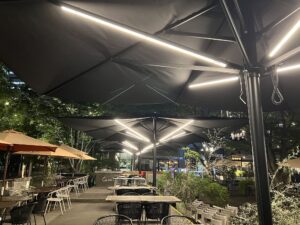 絶景のロケーションをお愉しみいただけます。レストランから続く見晴らしのよいガーデンに大型パラソルを採用いただいております。