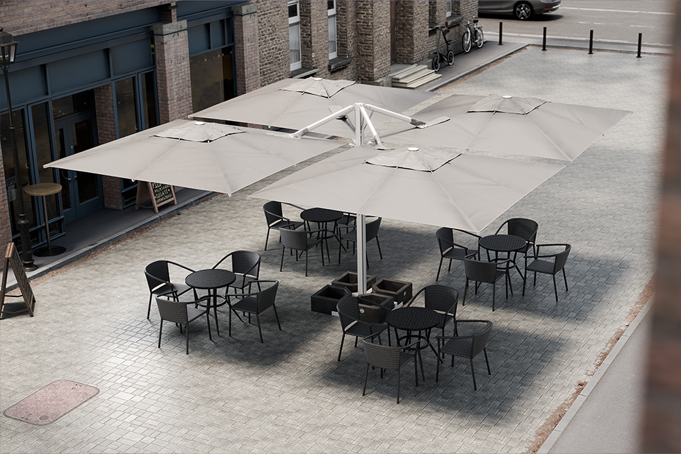 堅牢なアルミニウム構造が生んだ画期的デザインです。大空間をリッチにスタイリッシュに演出します。また、パラソルの収納は驚きのコンパクトサイズに、しかもテーブルと椅子の移動は不要です。