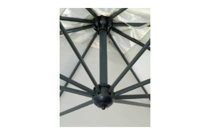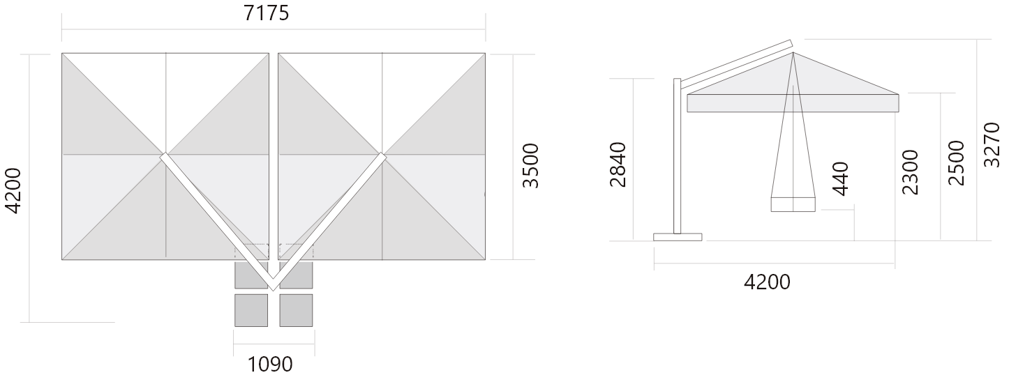 タテ、ヨコ3.5mを2台連結。支柱は1本で幅7m x 奥行3.5m の全体広さは24.5㎡の大型パラソルです。