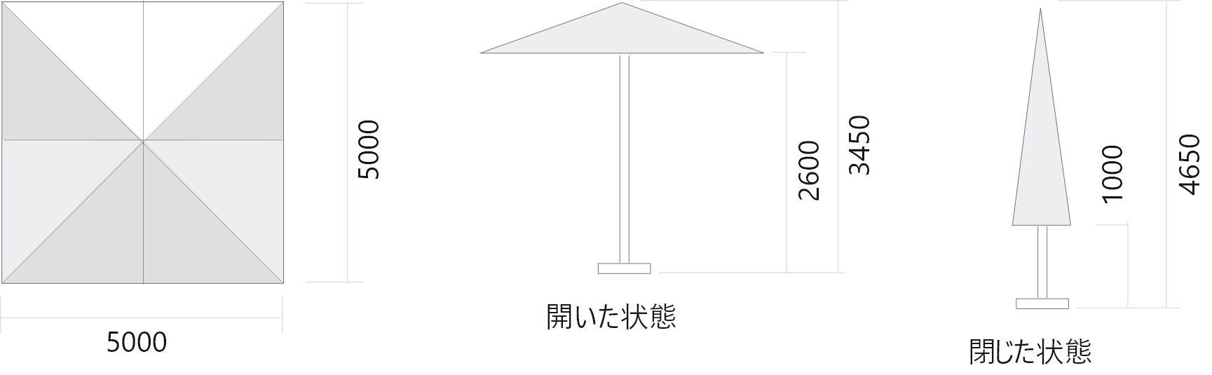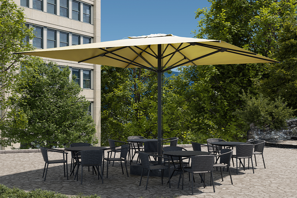 CP5050は、タテ、ヨコ5mの大型パラソルです。ガーデンスペースやリゾートに“新しい時”をお届けできるモデルです。