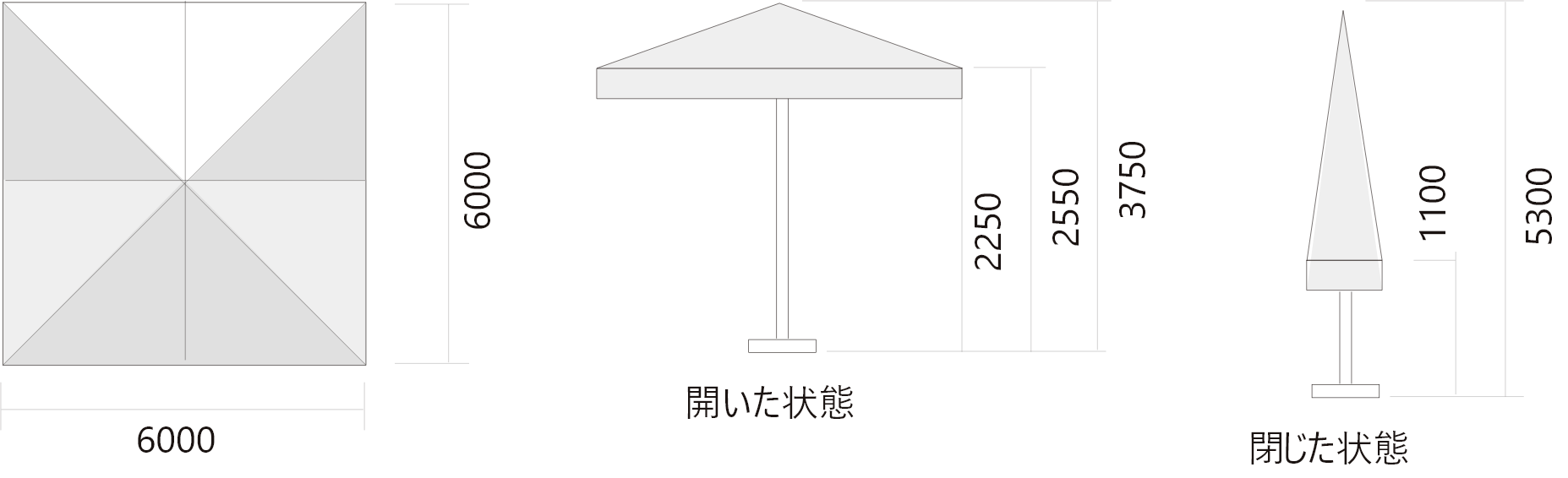 CP6060は、タテ、ヨコ6mの超大型パラソルです。インパクトのある空間演出を実現するプレミアムパラソルです。