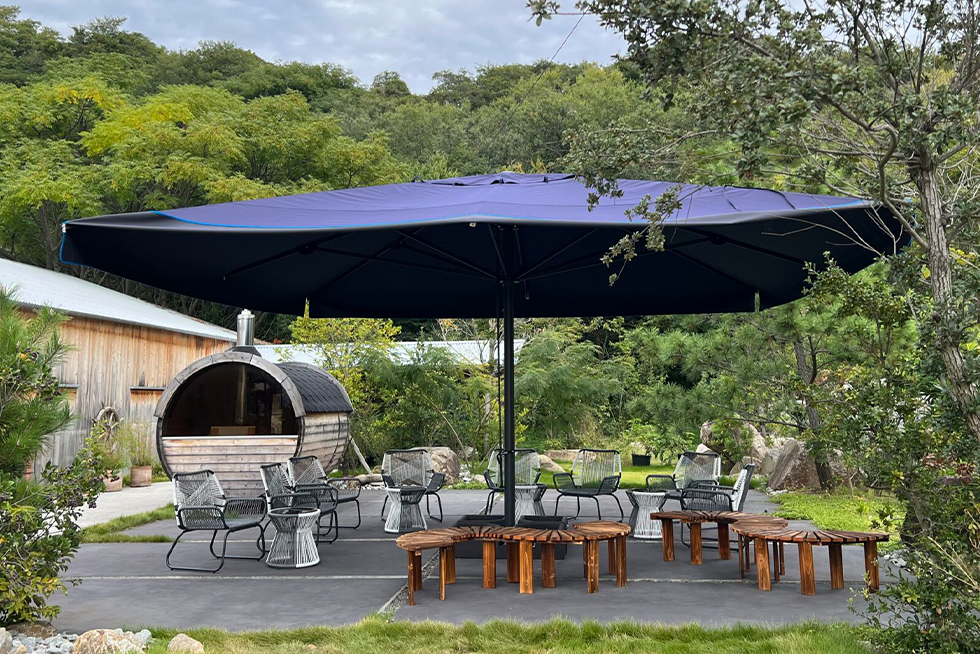 レストランから続く見晴らしのよいガーデンに大型パラソルを採用いただいております。