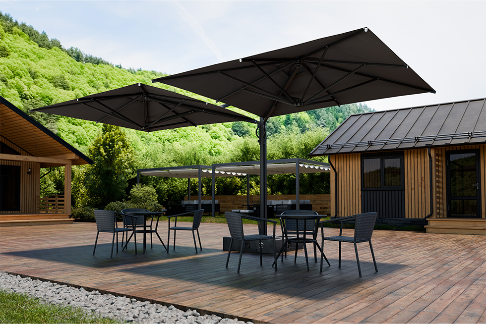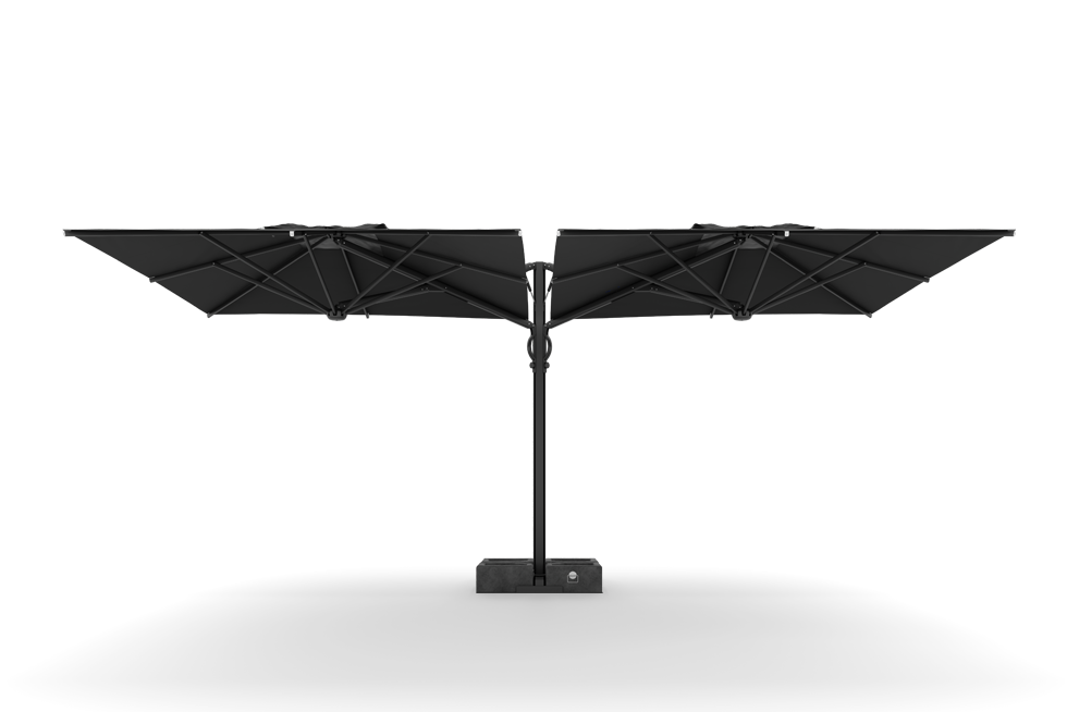 支柱1本のダブルパラソル 開閉もスムーズでスタイリッシュなデザイン。 1本の支柱に幅6m×奥行約3m、ダブルタイプの大型パラソル。 フレームカラーもホワイトとダークの2色展開×天幕25色とオリジナルパラソルをカスタマイズ。 スライドハンドルで開閉もスムーズ。家具を動かさずにパラソルを開閉できます。