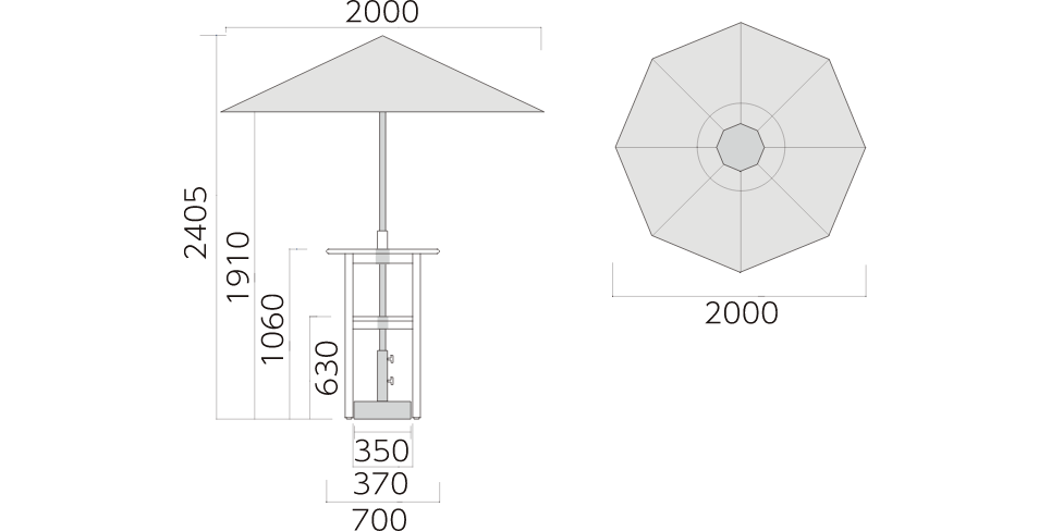 スタイリッシュなハイテーブルパラソル。 様々なシーンに手軽なクールスポットを街路沿いのカフェ、レストランのテラスや屋外のイートインなどにご利用いただけます。
